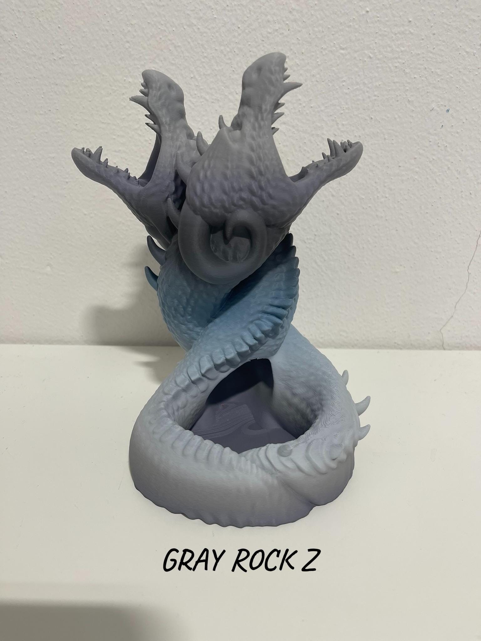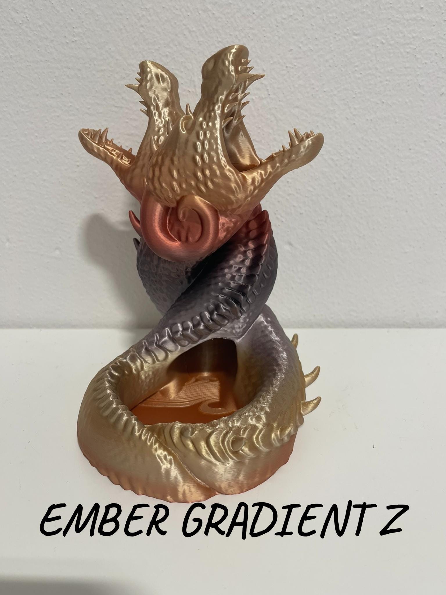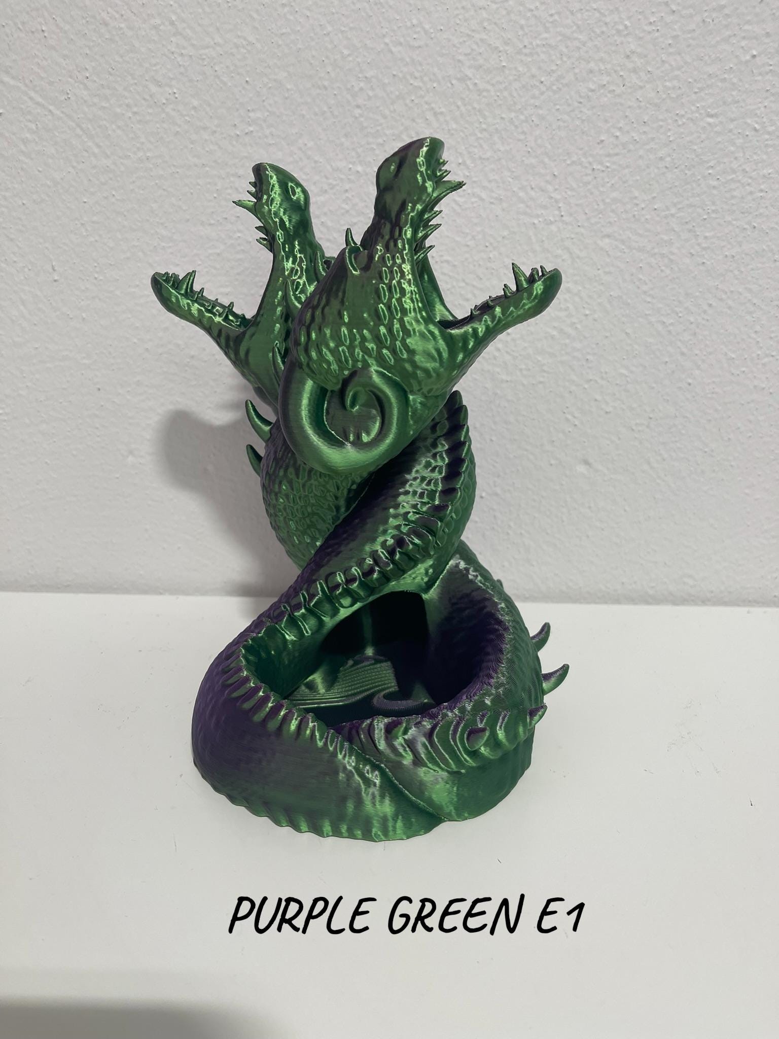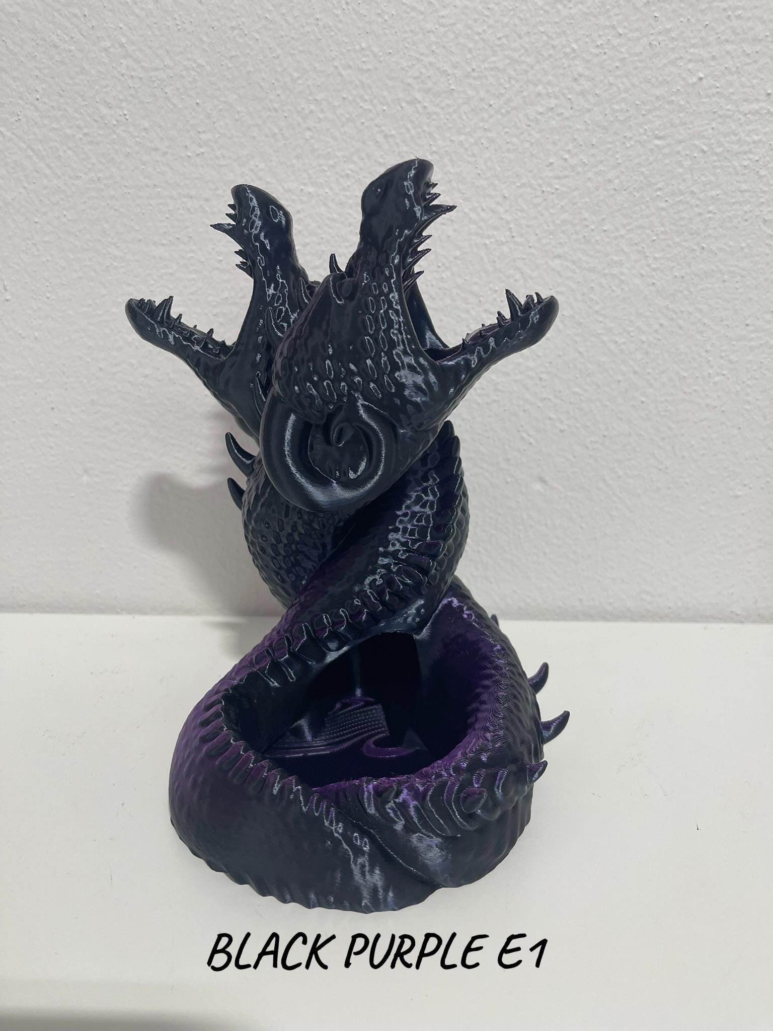 A dramatic fantasy dice tower featuring two intertwined dragons locked in combat. Drop your dice into the maw of this epic dueling pair, watch them tumble through hidden channels, and emerge at the base with a fair and random roll.