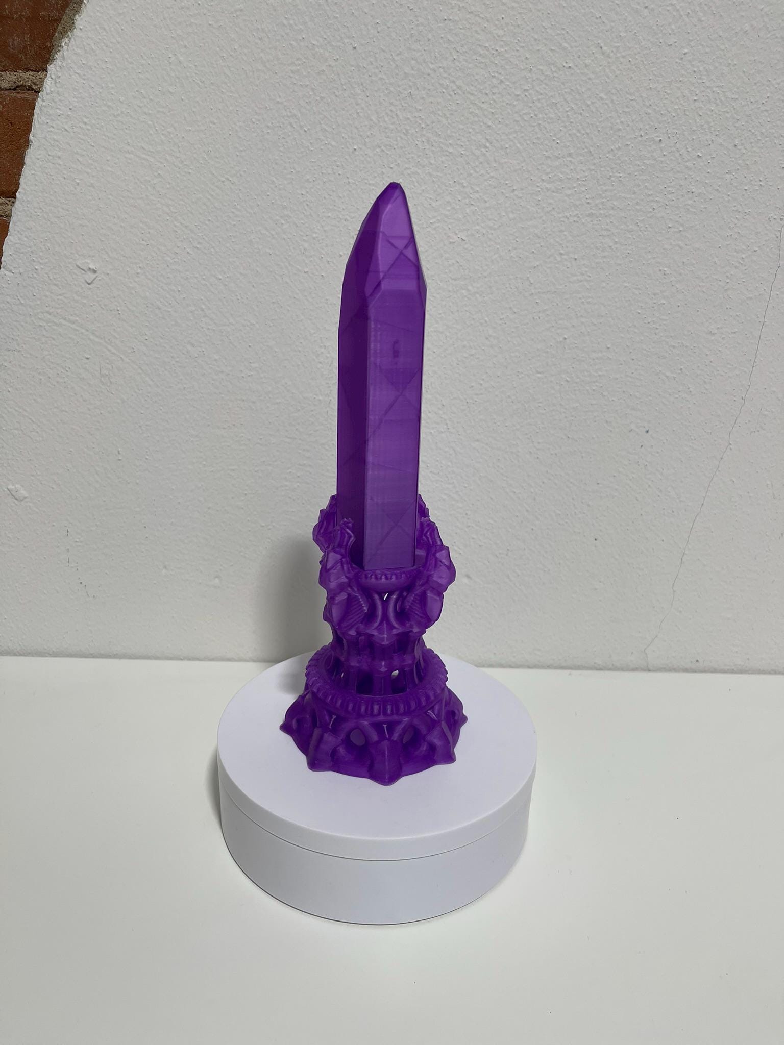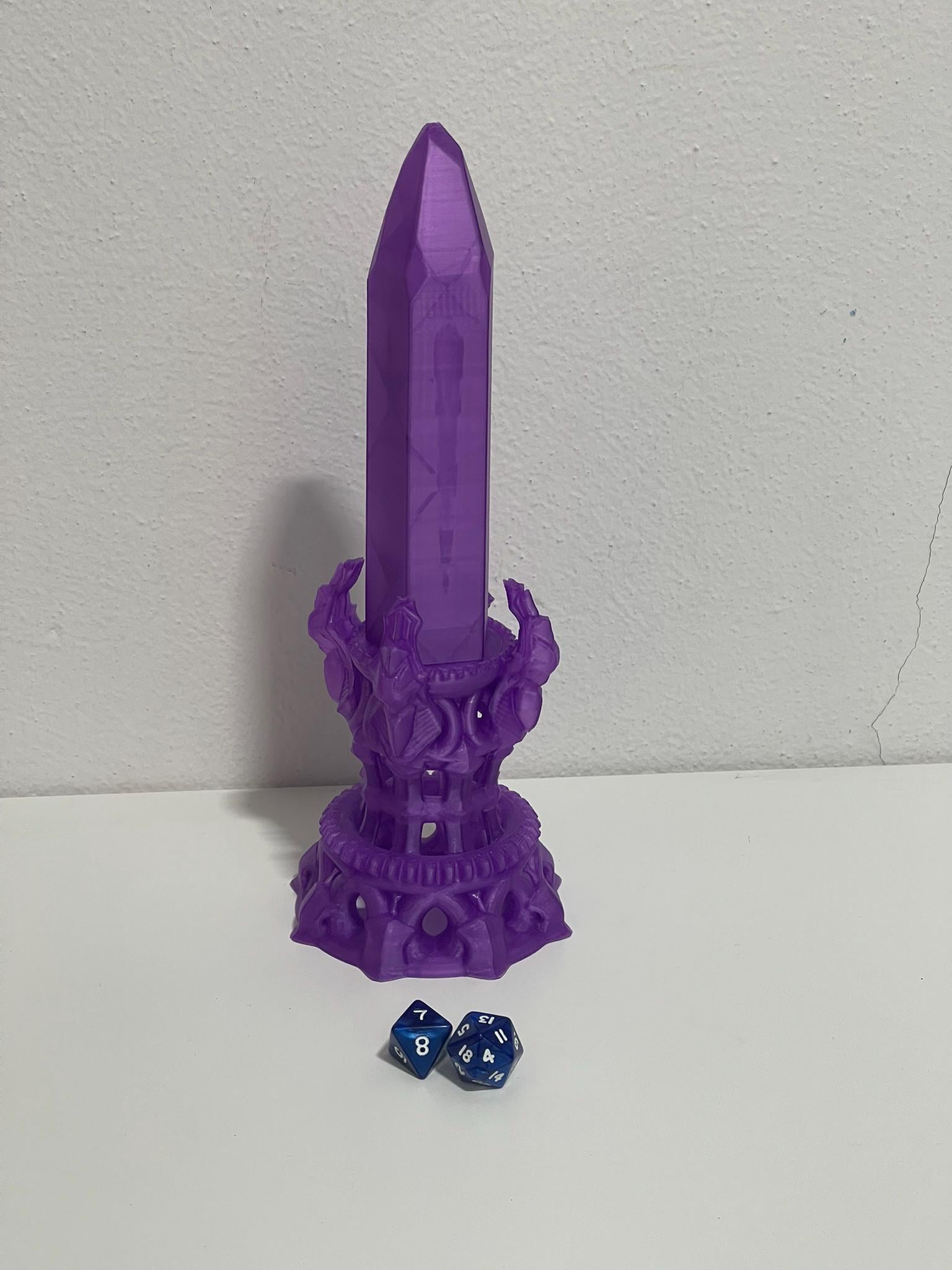 This striking crystal conceals a hidden screw-top storage compartment, perfect for holding your favorite polyhedral dice, metal sets, gemstone dice, or small gaming treasures. The detailed pedestal base gives it an arcane, dragon-guarded feel — like an artifact pulled straight from a wizard’s tower.