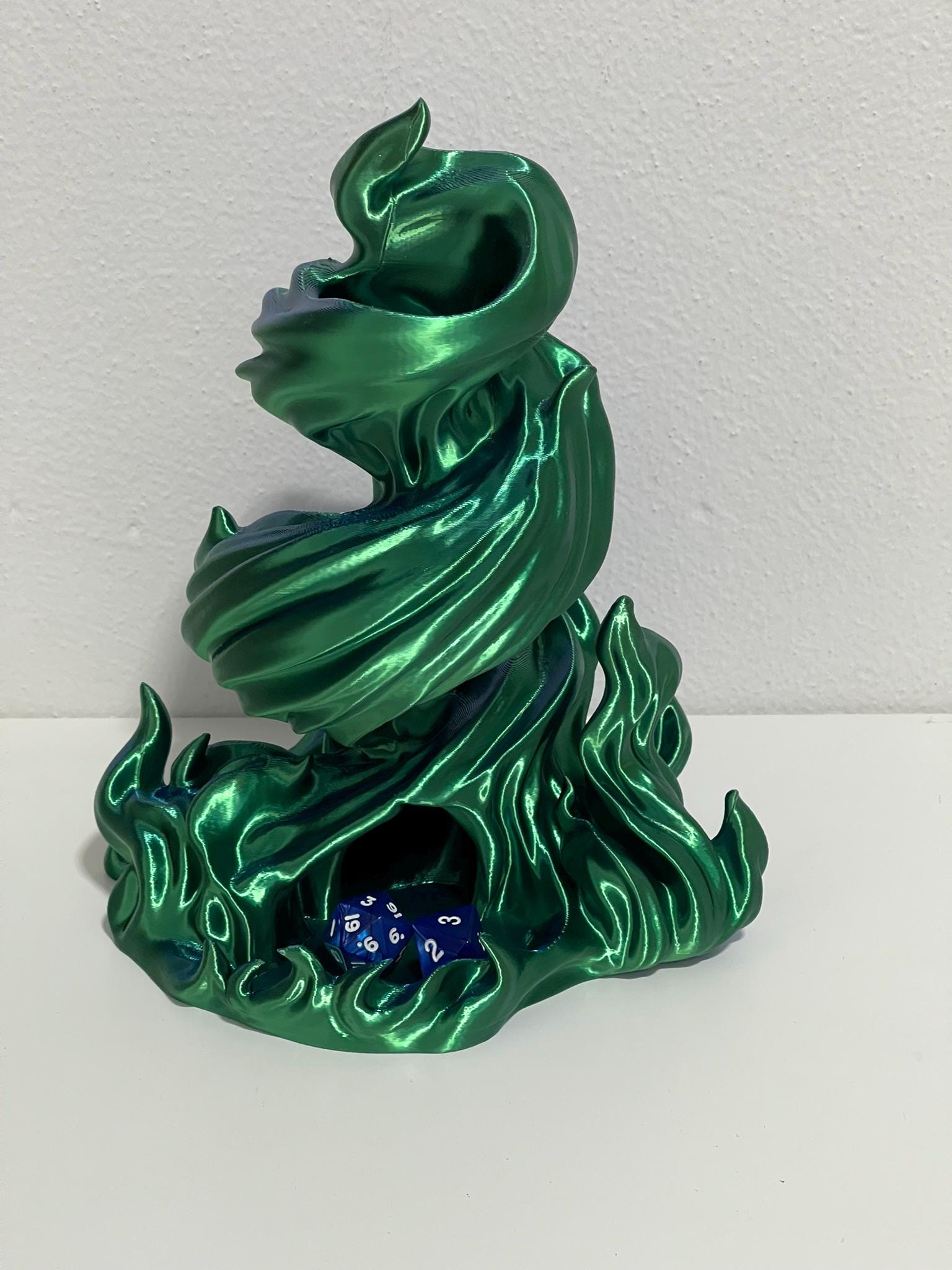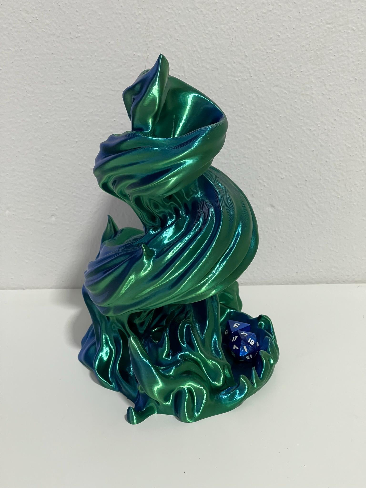 A spiraling wave wraps upward before guiding your dice through a smooth internal channel and into the base below. In deep blues or silks, it transforms into crashing water. In Blue/Green, it feels like a summoned elemental rising from the depths.