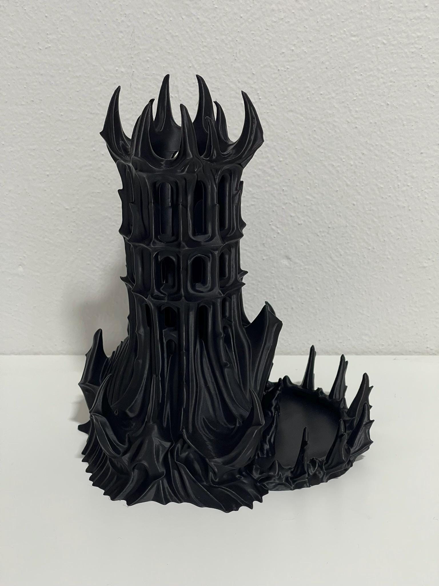 Spiked battlements rise above narrow windows as your dice enter from the top and descend through a controlled internal path before landing in the catch tray below. Every roll feels deliberate. Heavy. Final.