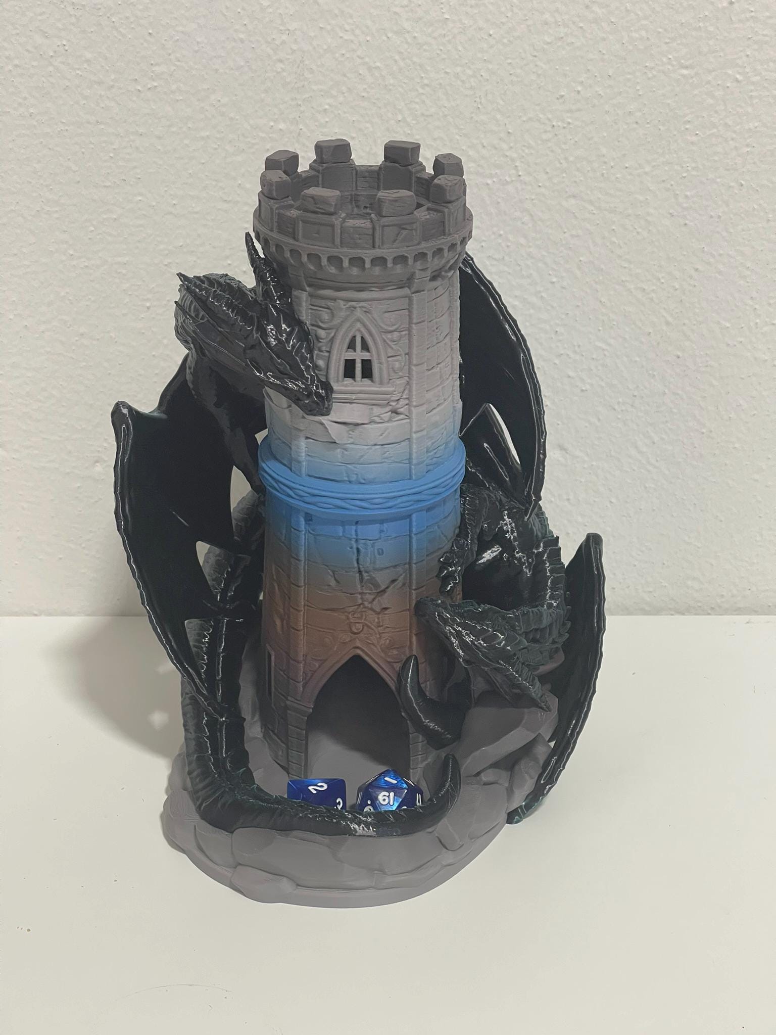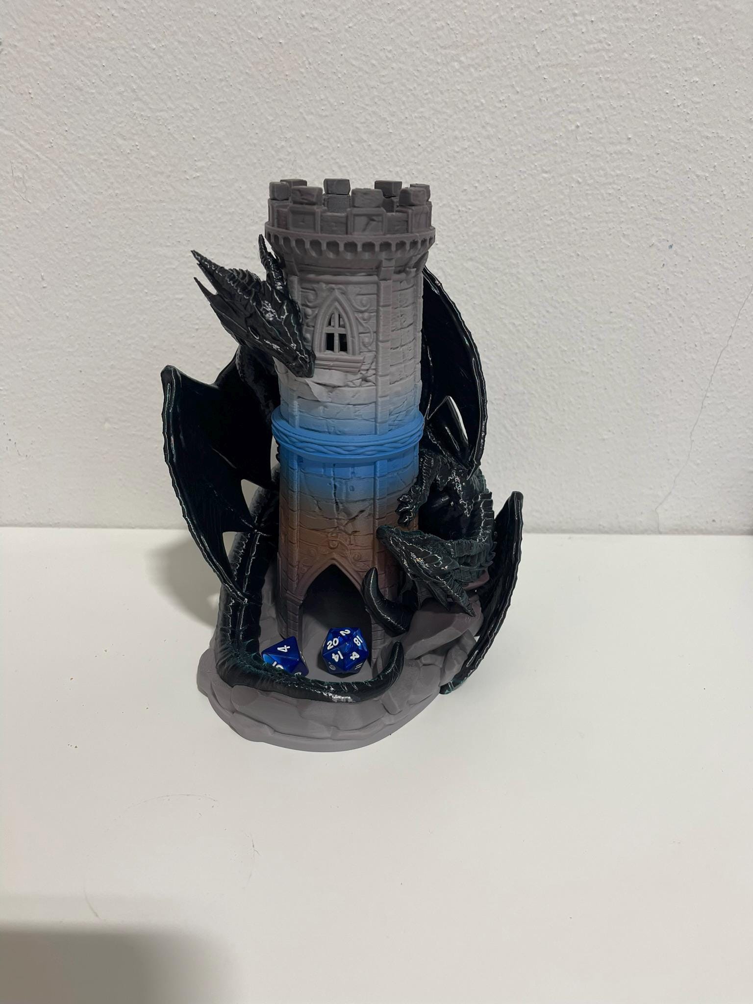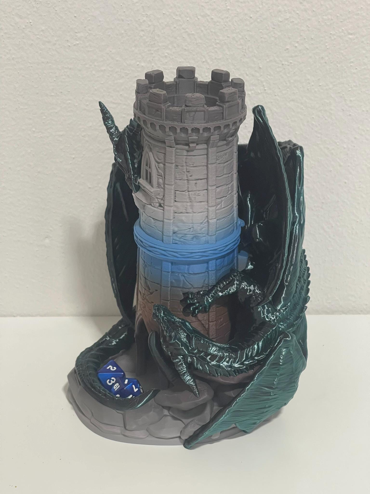 This 3D printed dragon castle dice tower is designed for tabletop RPG players who want something dramatic on the table without being oversized or distracting. The dual dragons frame the tower, creating a strong silhouette while keeping dice contained and controlled.