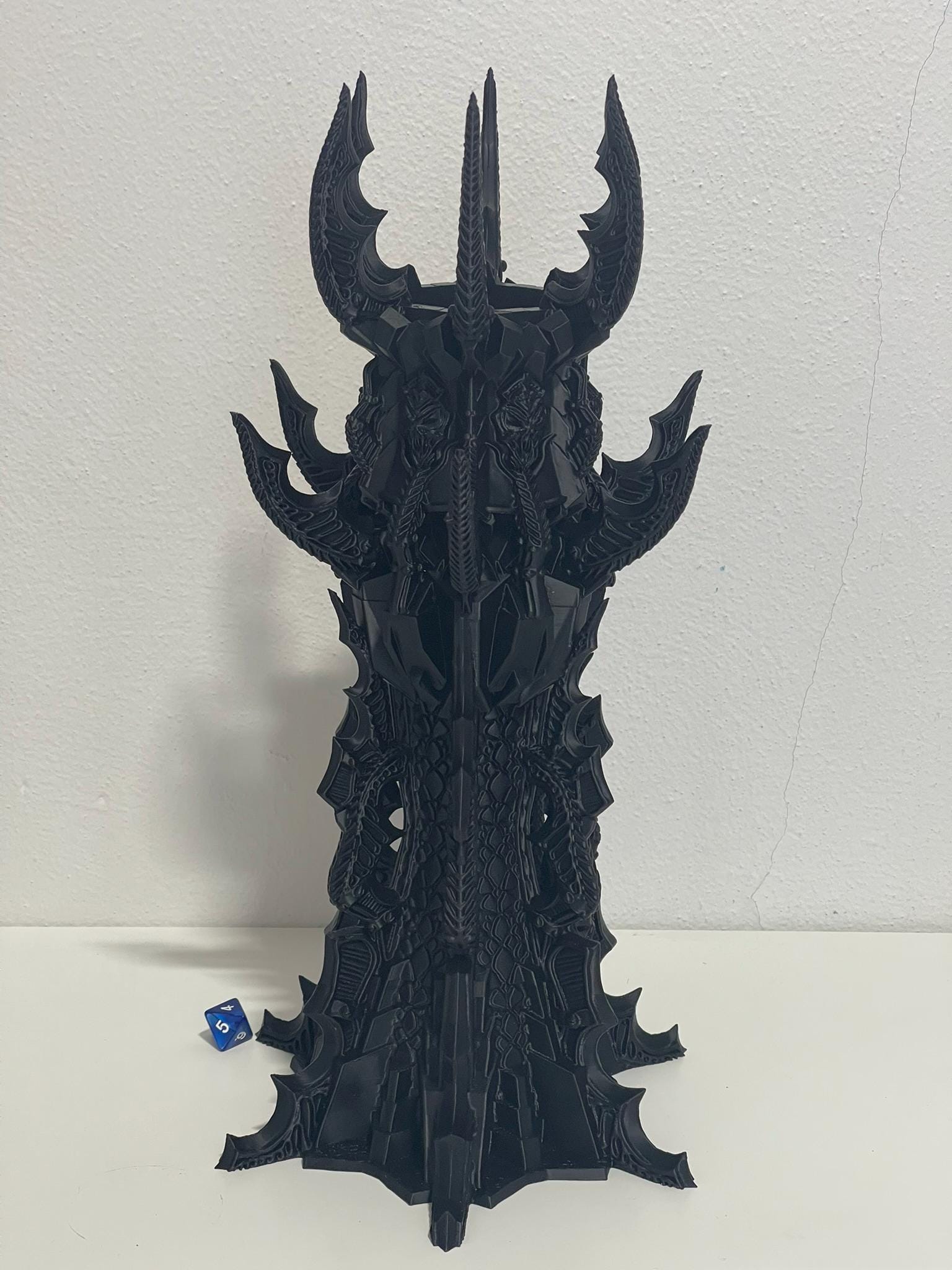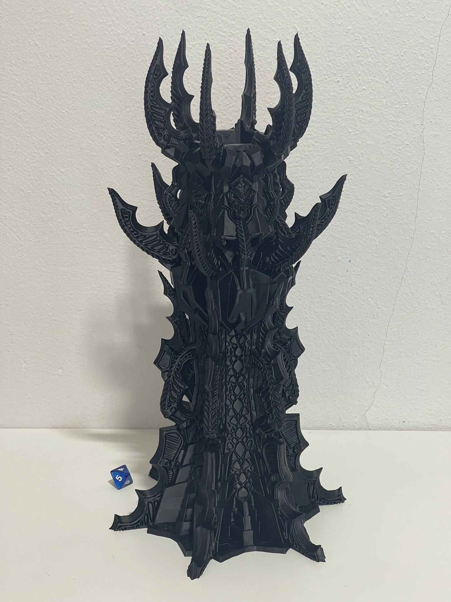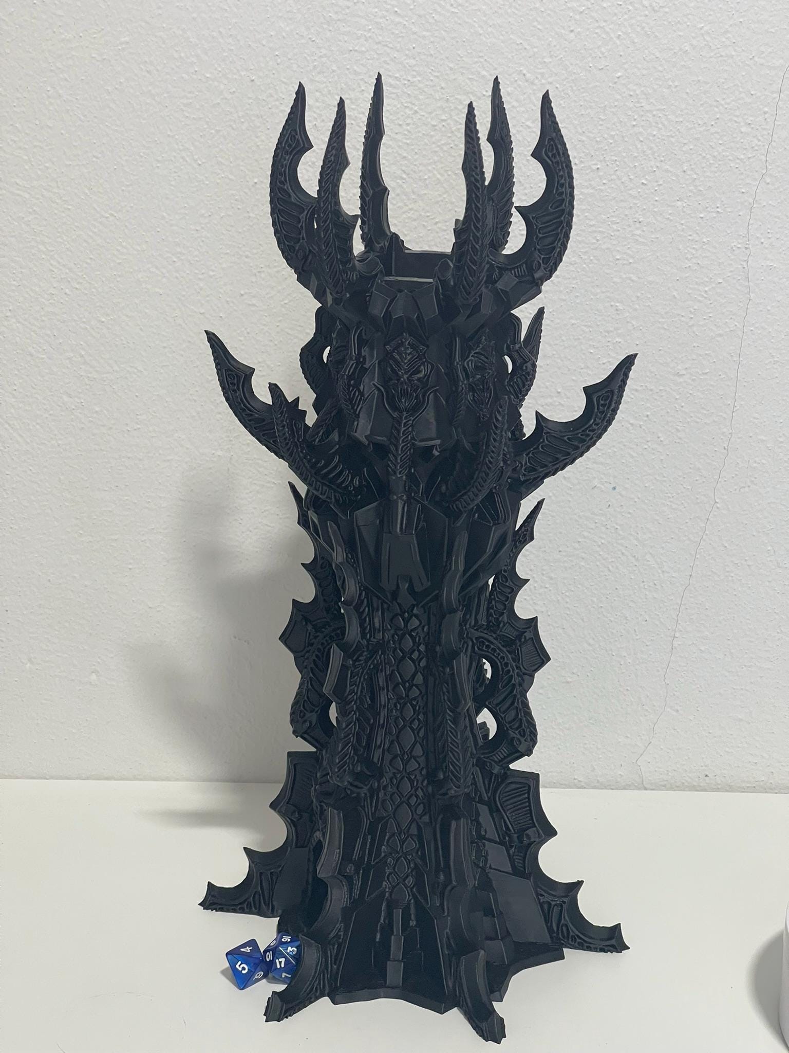 Cast from shadow and shaped like a war helm crowned in blades, the Banished Vampire’s Dice Tower rises like a monument to a fallen lord of the night. Jagged spires, armored ridges, and gothic detailing give this piece a commanding presence at any table.